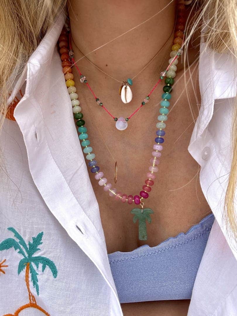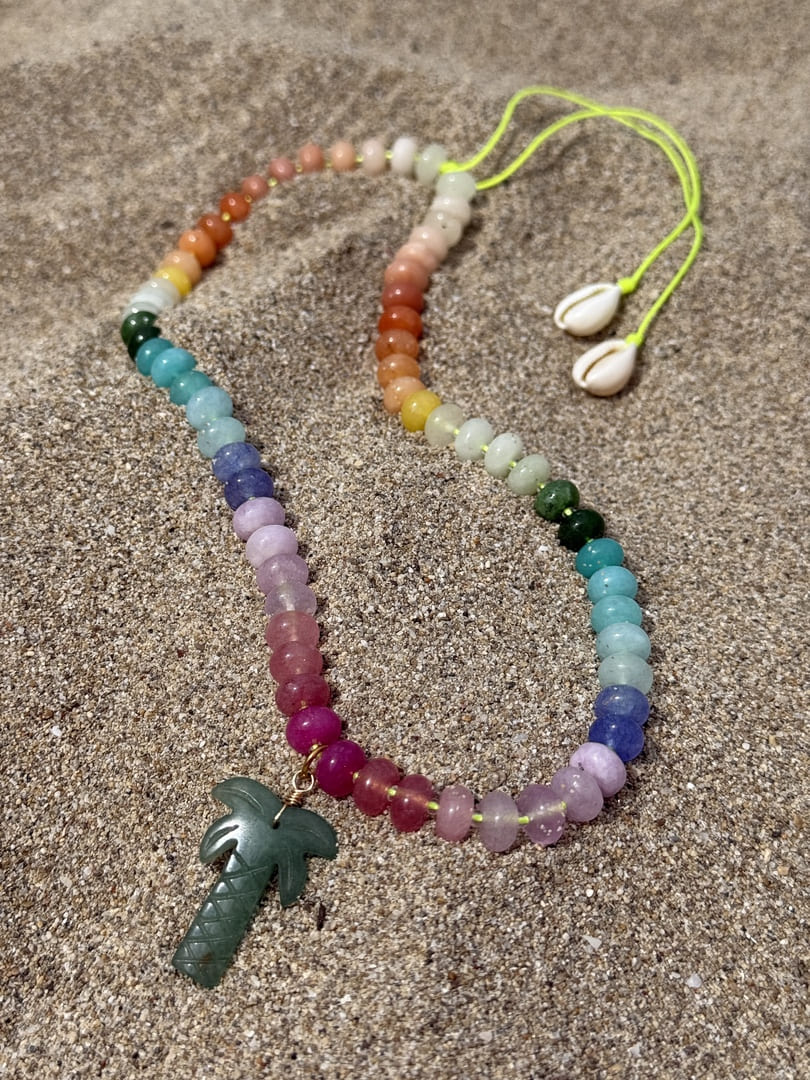 Collier Palmito Rainbow Sun of Lo, composé d’un dégradé de perles de pierres naturelles colorées multicolores et d’un pendentif palmier sculpté en aventurine verte.