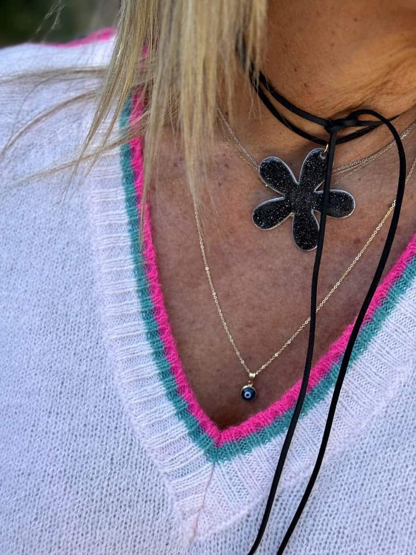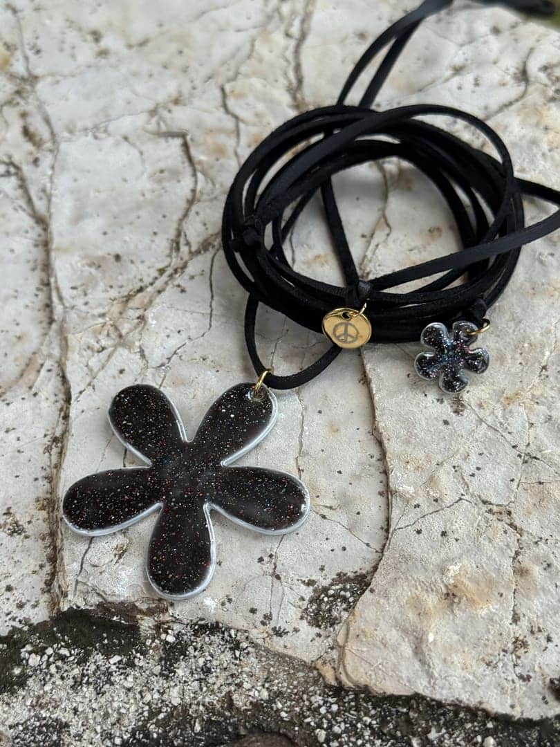 Cordon Daisy Be Hippy composé d’une fleur en nacre sculptée à la main et émaillée noir à paillettes multicolores, montée sur un cordon de suède noir. A nouer selon vos envies et votre look : ras de cou, sautoir …