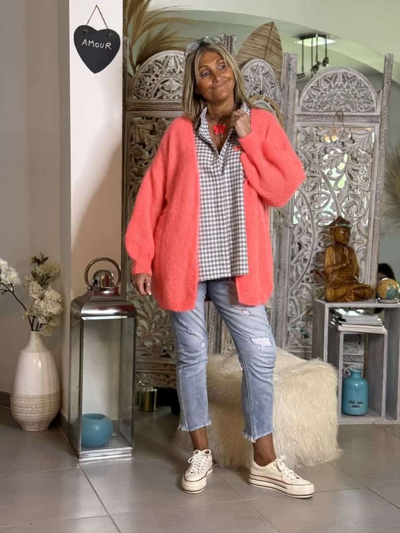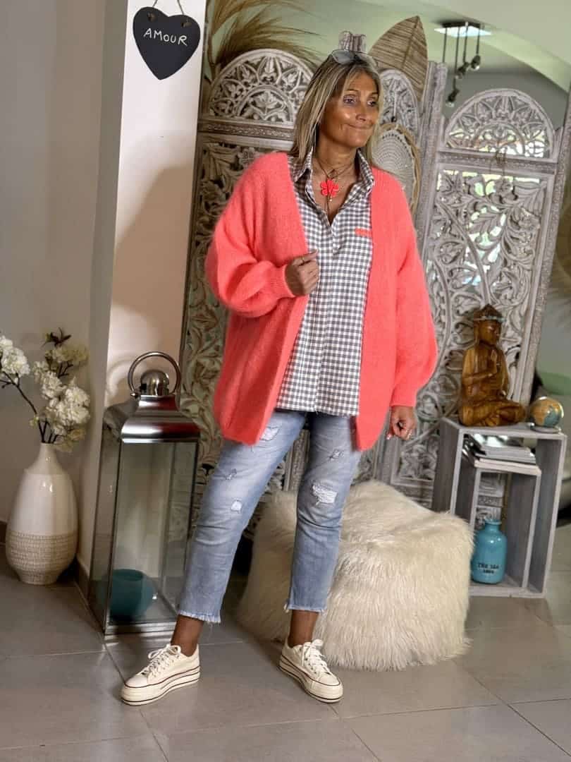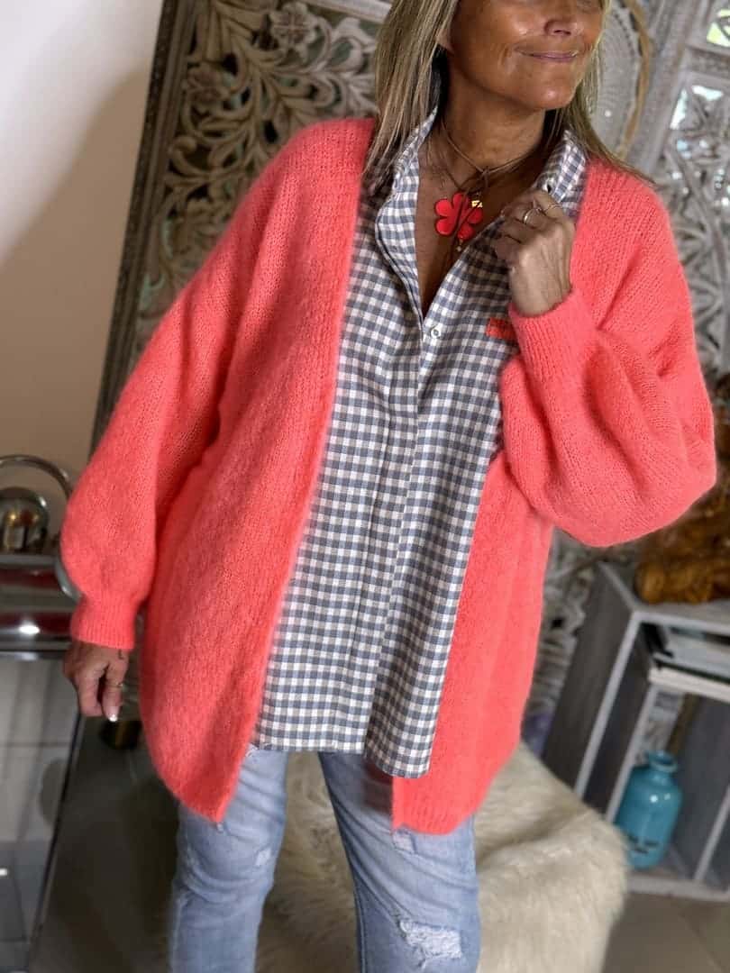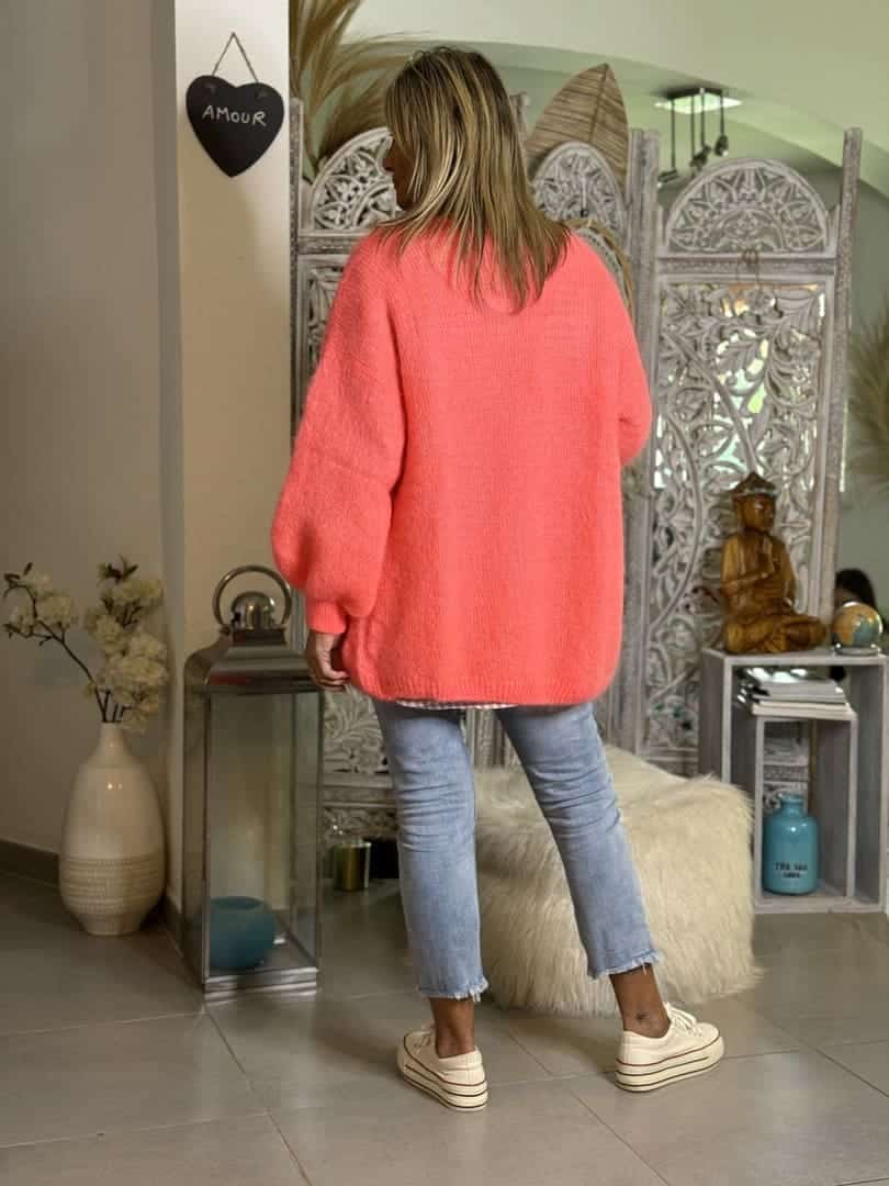 Gilet Sweety en maille mohair corail chaude et légère, coupe droite loose à bords francs, manches boules élastiquées au poignet.