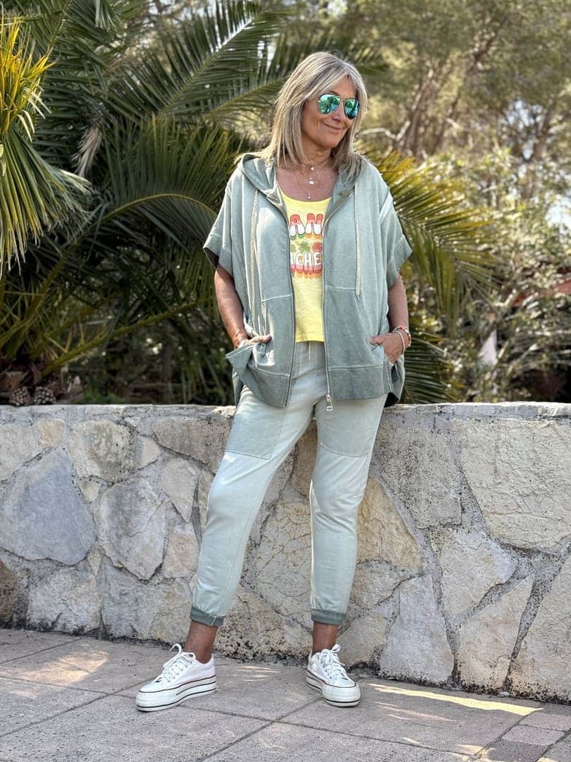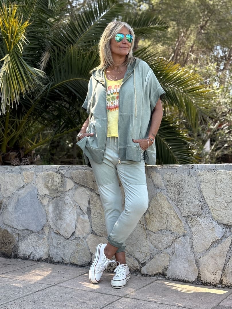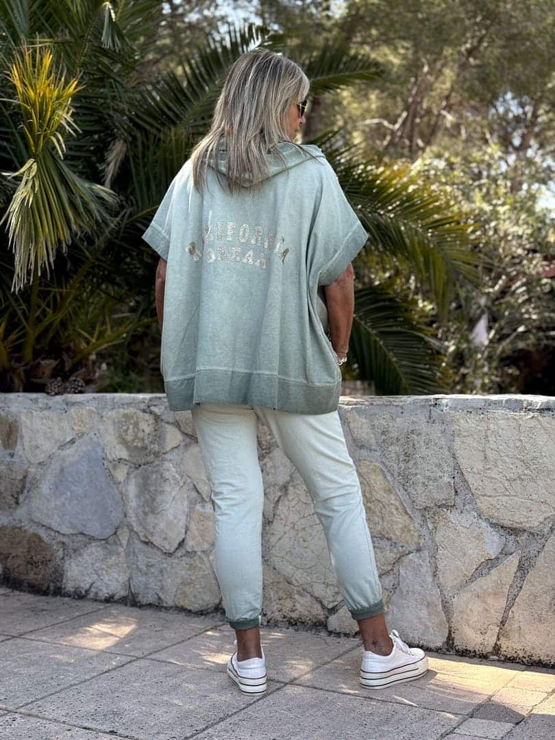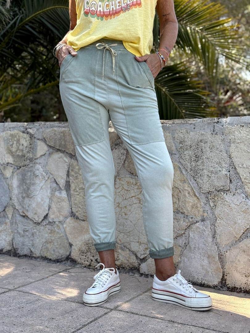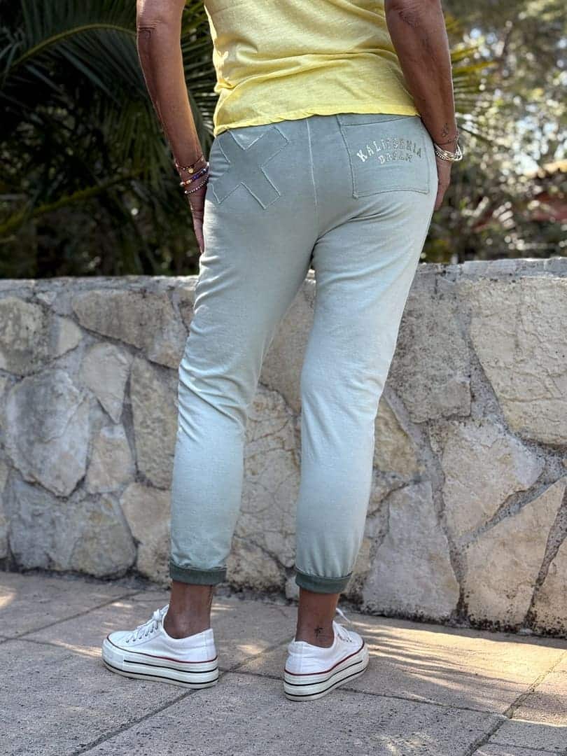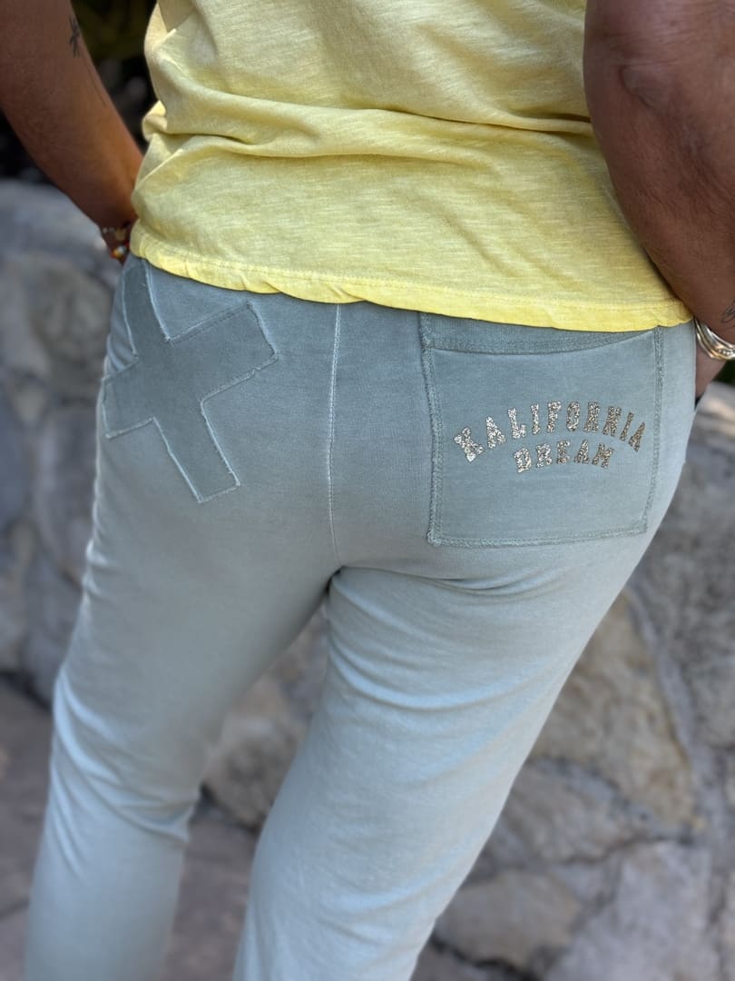 Jogg Miami Kalifornia Dream en coton vintage délavé kaki, coupe moulante et taille haute (peut se porter façon baggy), finition cotelée. Lien de serrage doré, grandes poches sur les hanches, impression « Kalifornia Dream » doré pailletée sur les fesses.