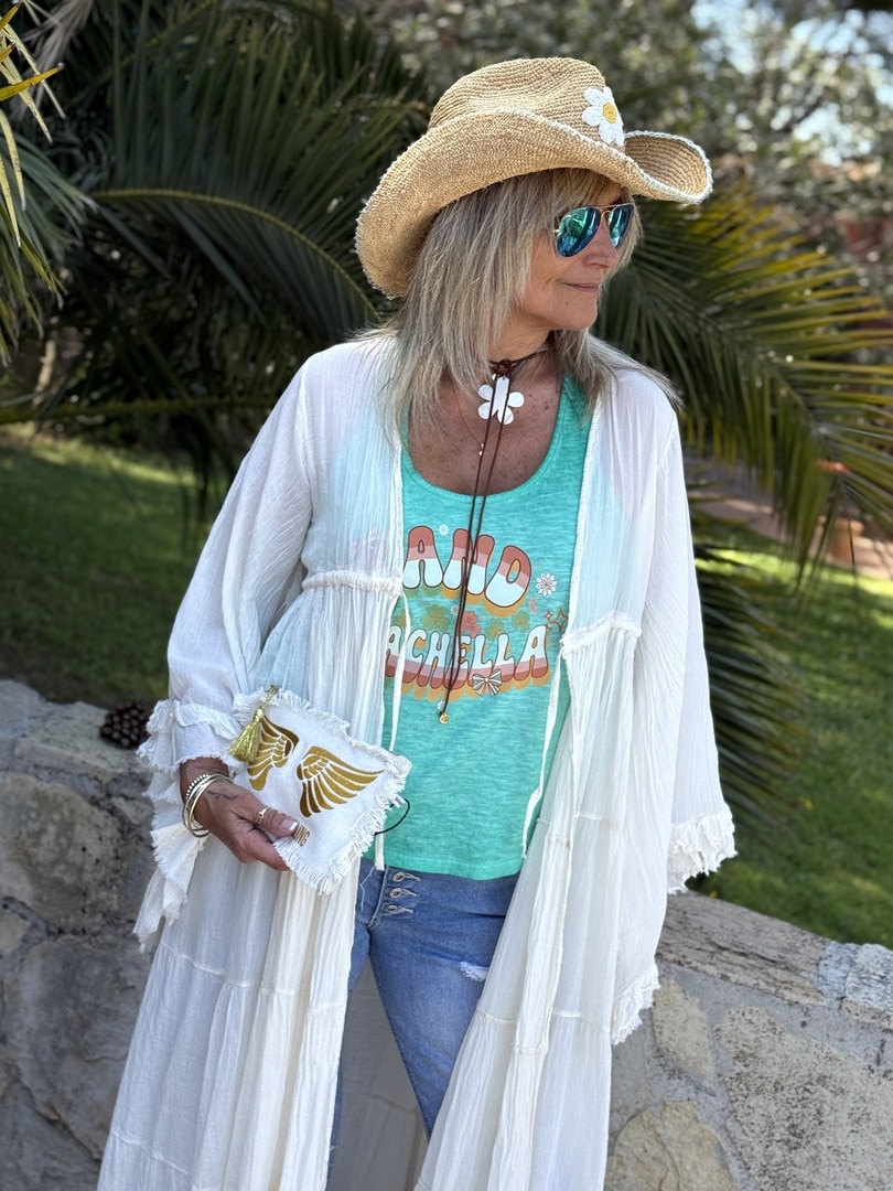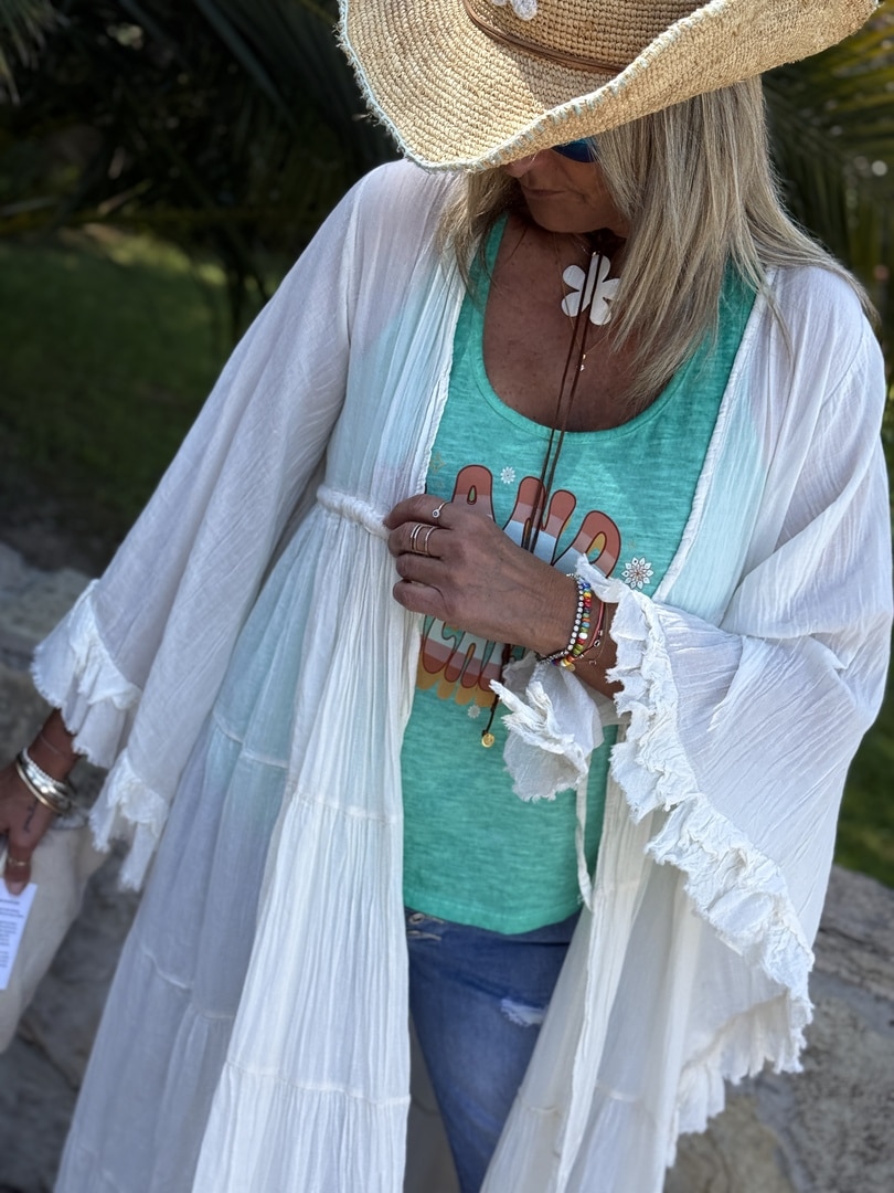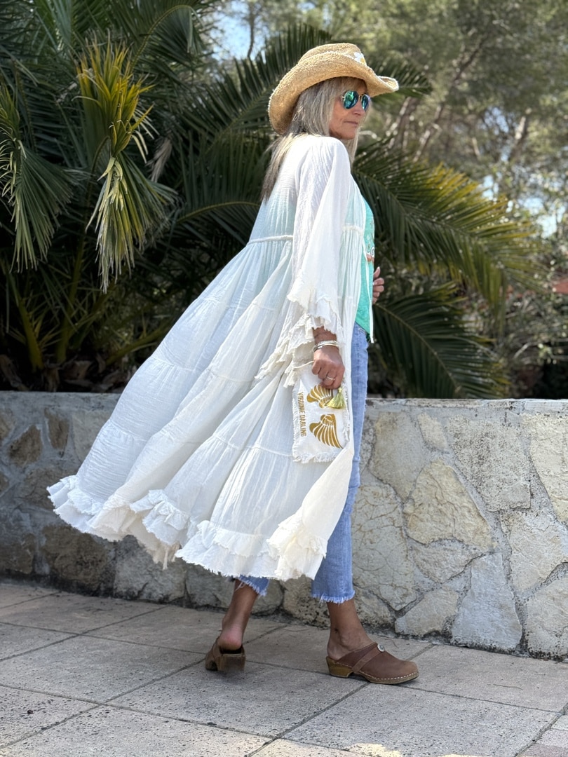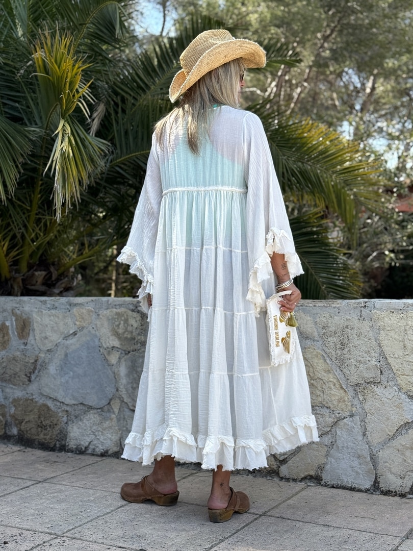 Kimono Es Vedra en voile de coton écru, coupe évasée à volants et bords francs, resserré sous la poitrine par un lien ajustable. Manches évasées fendues et finition frangée.