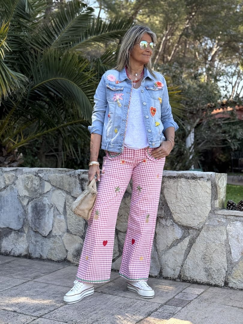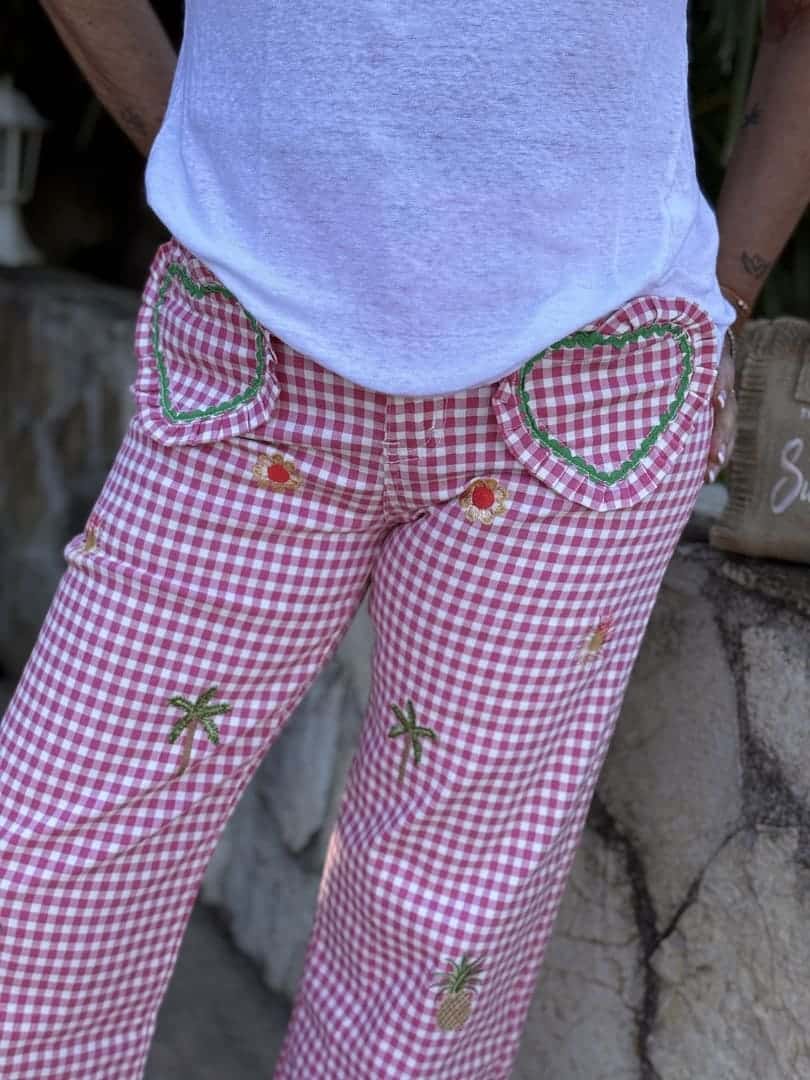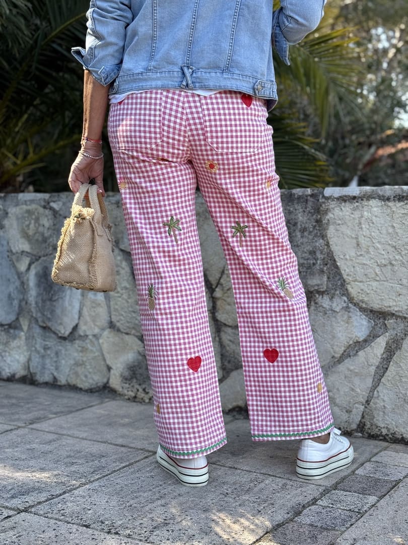 Pantalon Coconut Love Pink en toile coton stretch imprimée vichy rose, coupe droite et taille haute, poches plaquées volantées en forme de cœur sur les hanches. Broderies colorées exotiques : palmier, ananas, coeur, fleur …