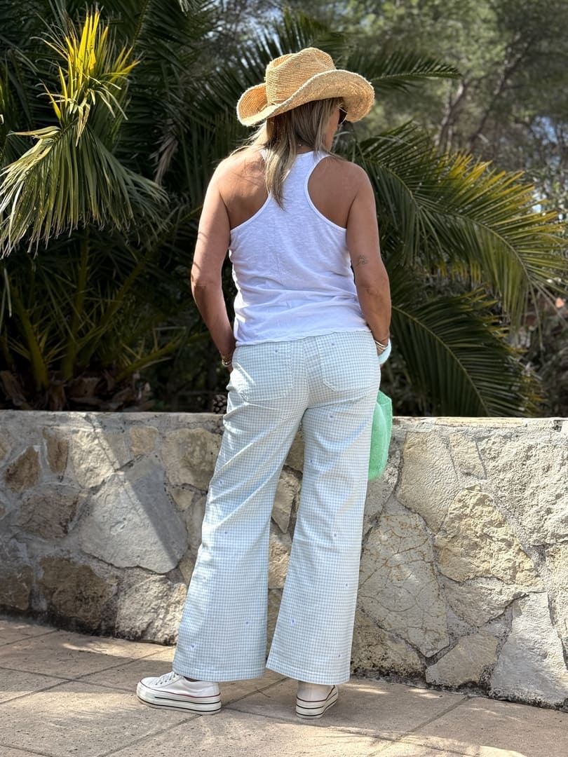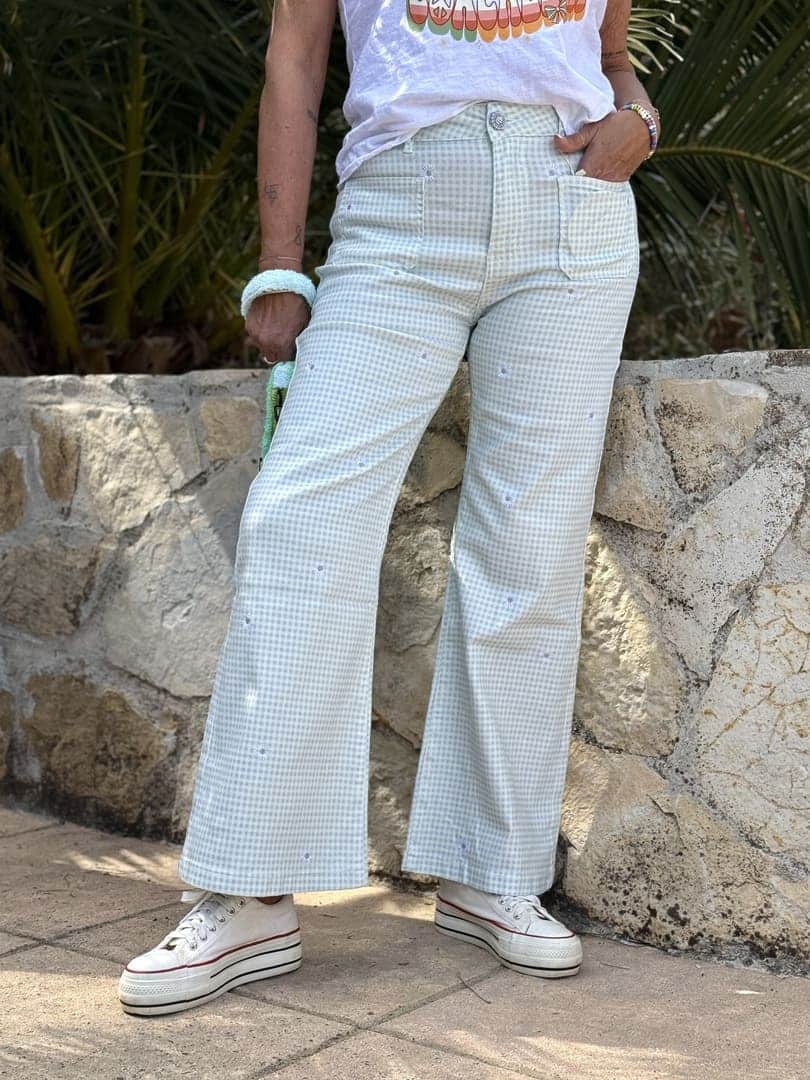 Pantalon Daisy Forever en toile coton stretch imprimée vichy aqua, coupe évasée et taille haute. Poches plaquées sur les hanches, broderies marguerites sur l’ensemble du pantalon.