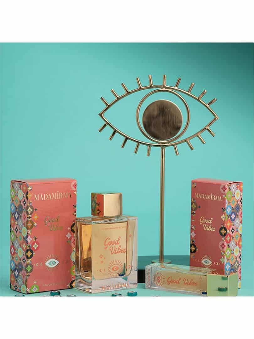 Eau de parfum Good Vibes Madamirma. Un shot de bonnes ondes vitaminées, issu du mariage subtil entre la fleur d’oranger et la fève Tonka, et sublimé par des accords de musc blanc et patchouli …