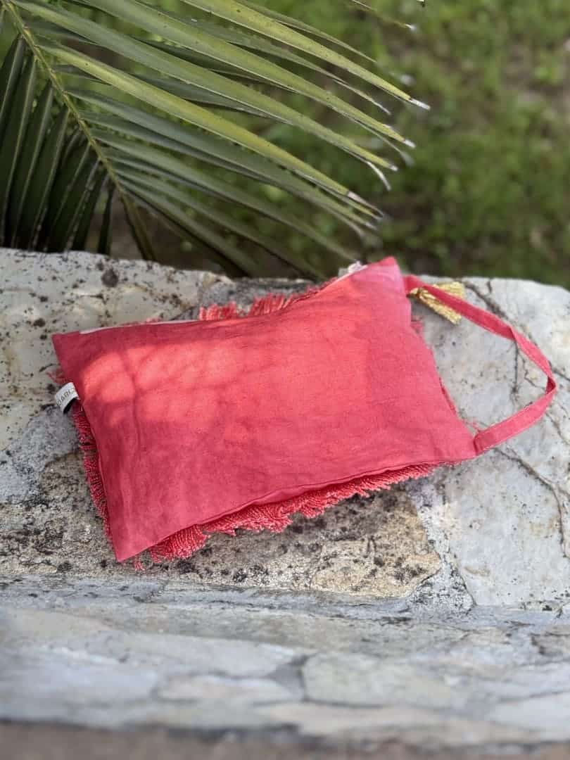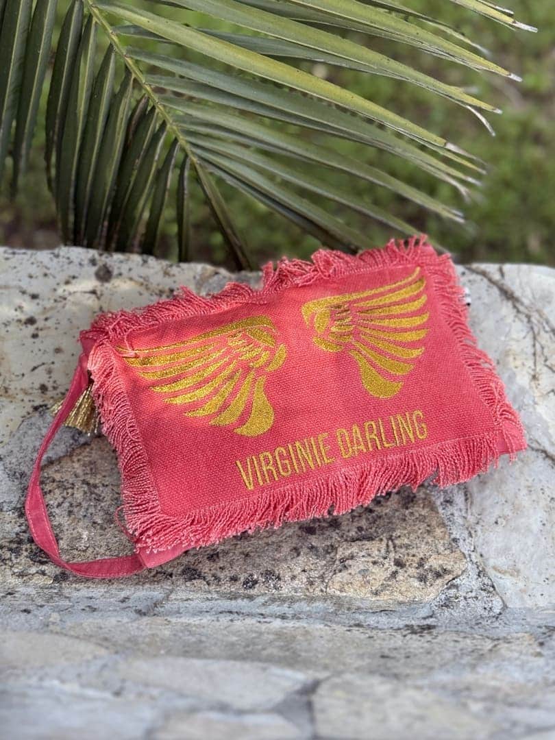 Pochette Smooth Angel Virginie Darling en toile de lin tie and dye rose corail, forme rectangulaire plate à fermeture zip, empiècement sur l’avant de coton frangé avec broderie ailes au fil d’or.