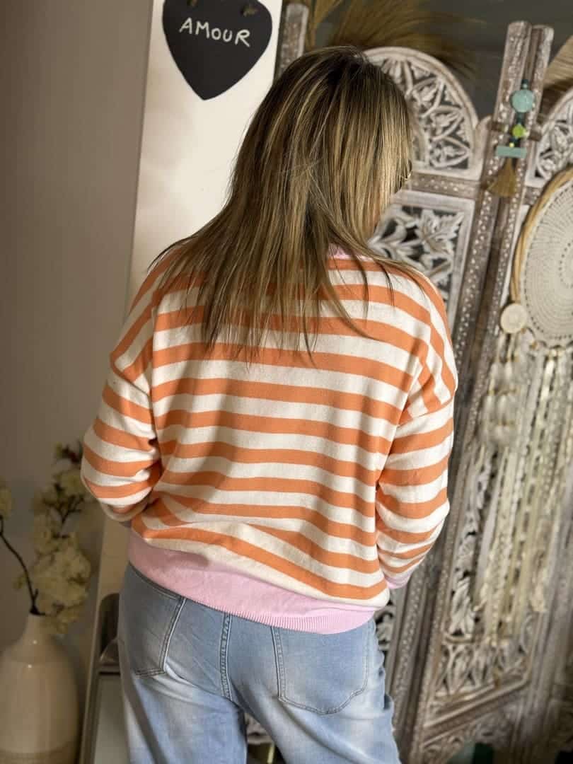 Pull Are you Okay en maille à rayures orange et blanc, coupe droite à manches longues et décolleté V, finition côtelée rose pâle. Inscription bouclette et paillettes colorée sur l’avant.