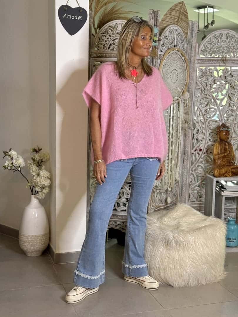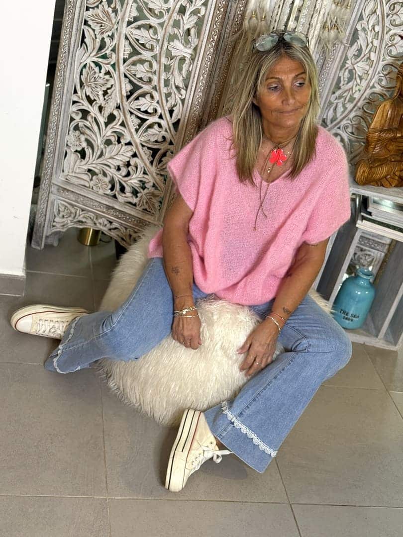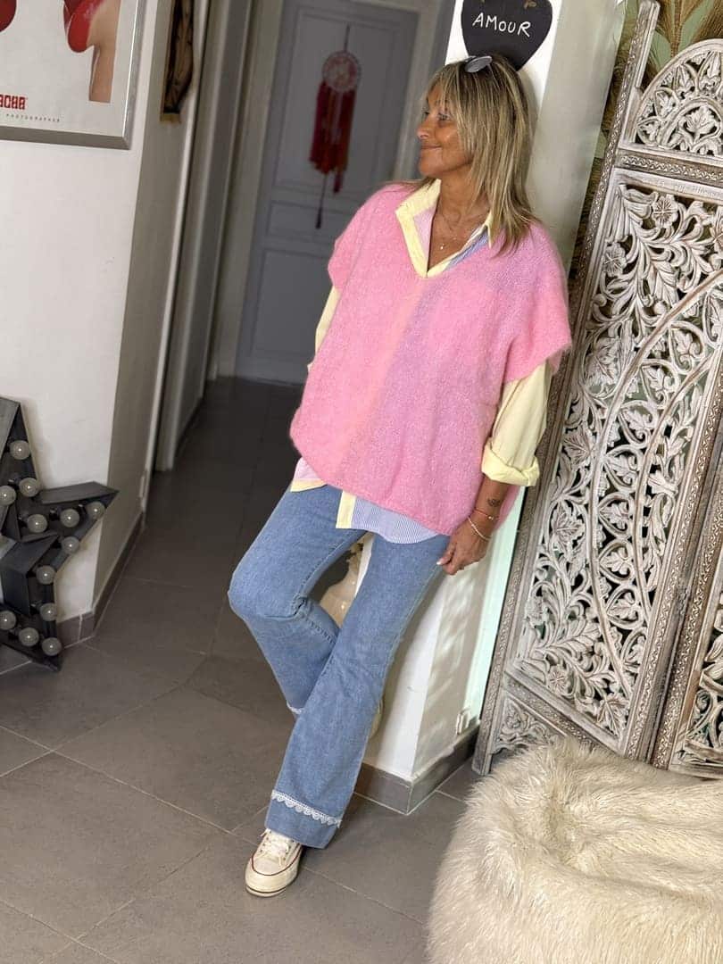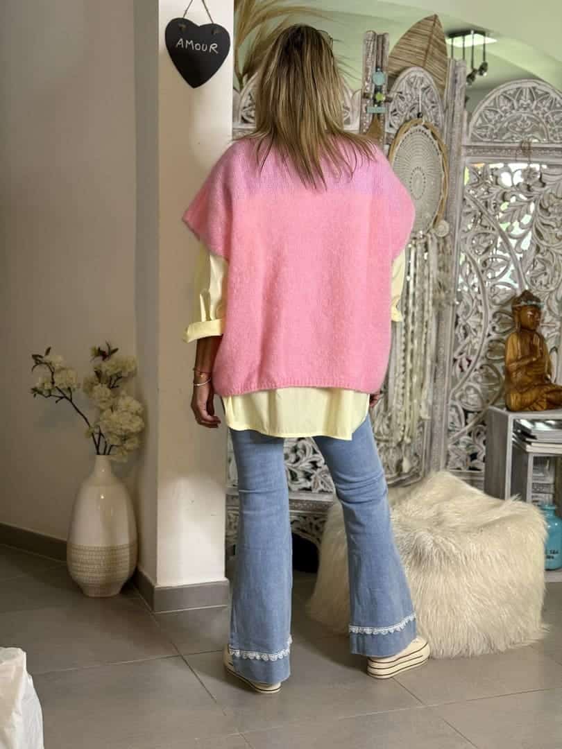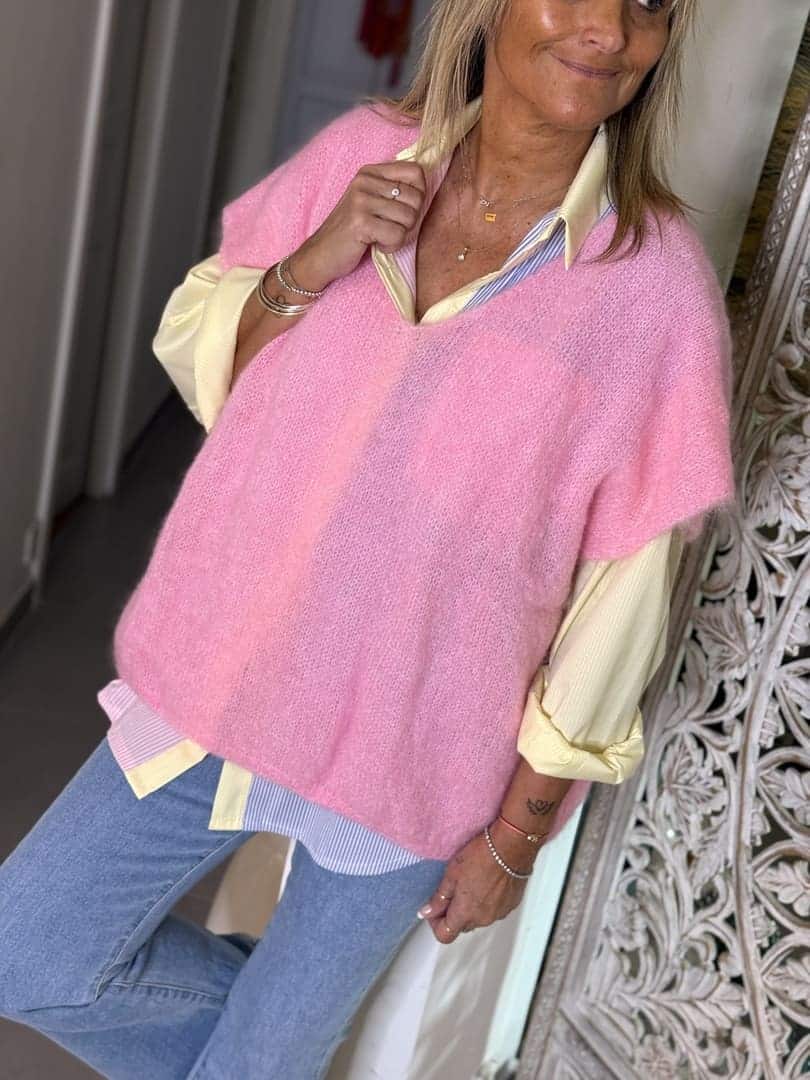 Pull Sweety en maille mohair rose bonbon chaude et légère, coupe droite loose sans manches et décolleté V. A porter seul ou en superposition sur une chemise.