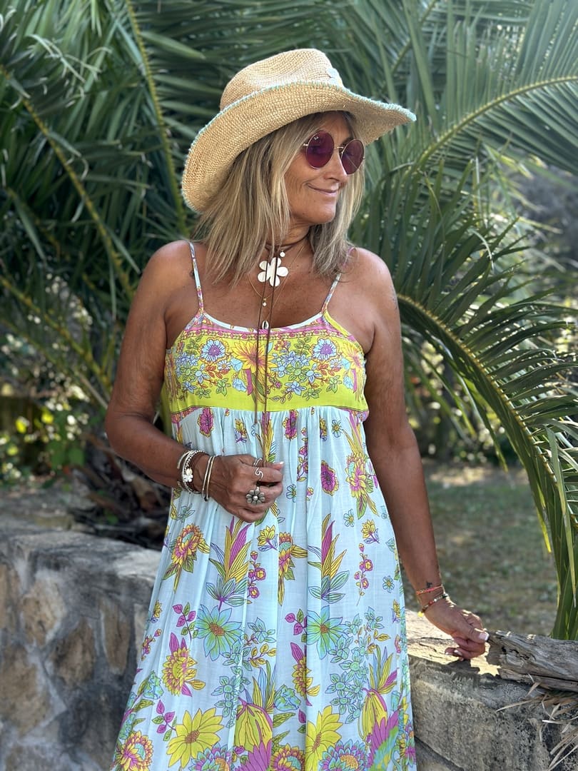 Robe Open Back Sand Coachella, thème Flamingo couleur Aqua, en tissu fluide imprimé gypsy dans les tons de aqua, vert anis et fuchsia. Coupe droite évasée à bretelles réglables, grand décolleté dans le dos.