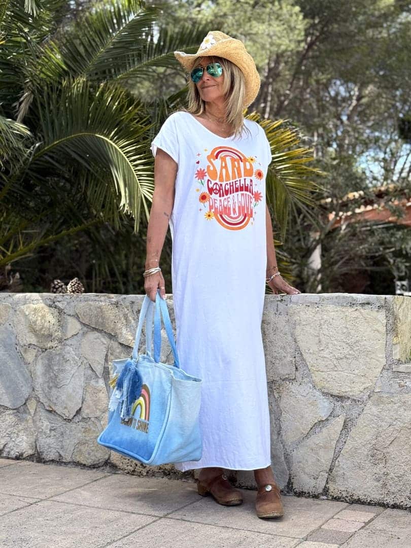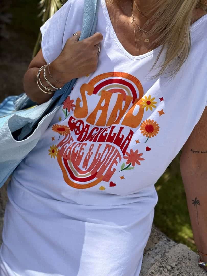 Robe Peace & Love Sand Coachella en coton vintage blanc, coupe droite fluide à manches courtes, décolleté V devant et dans le dos, lien noué ajustable. Print vintage coloré sur le devant.