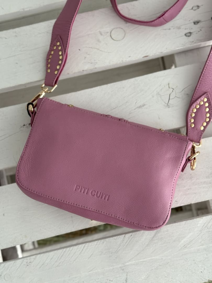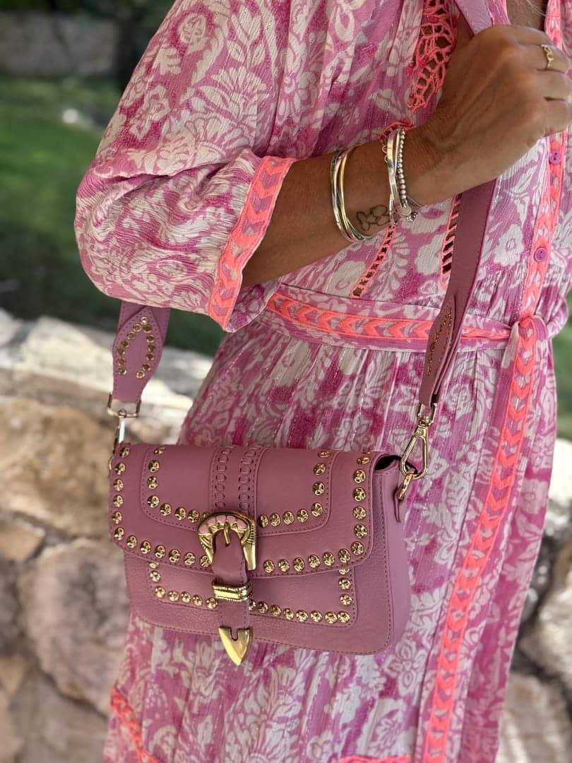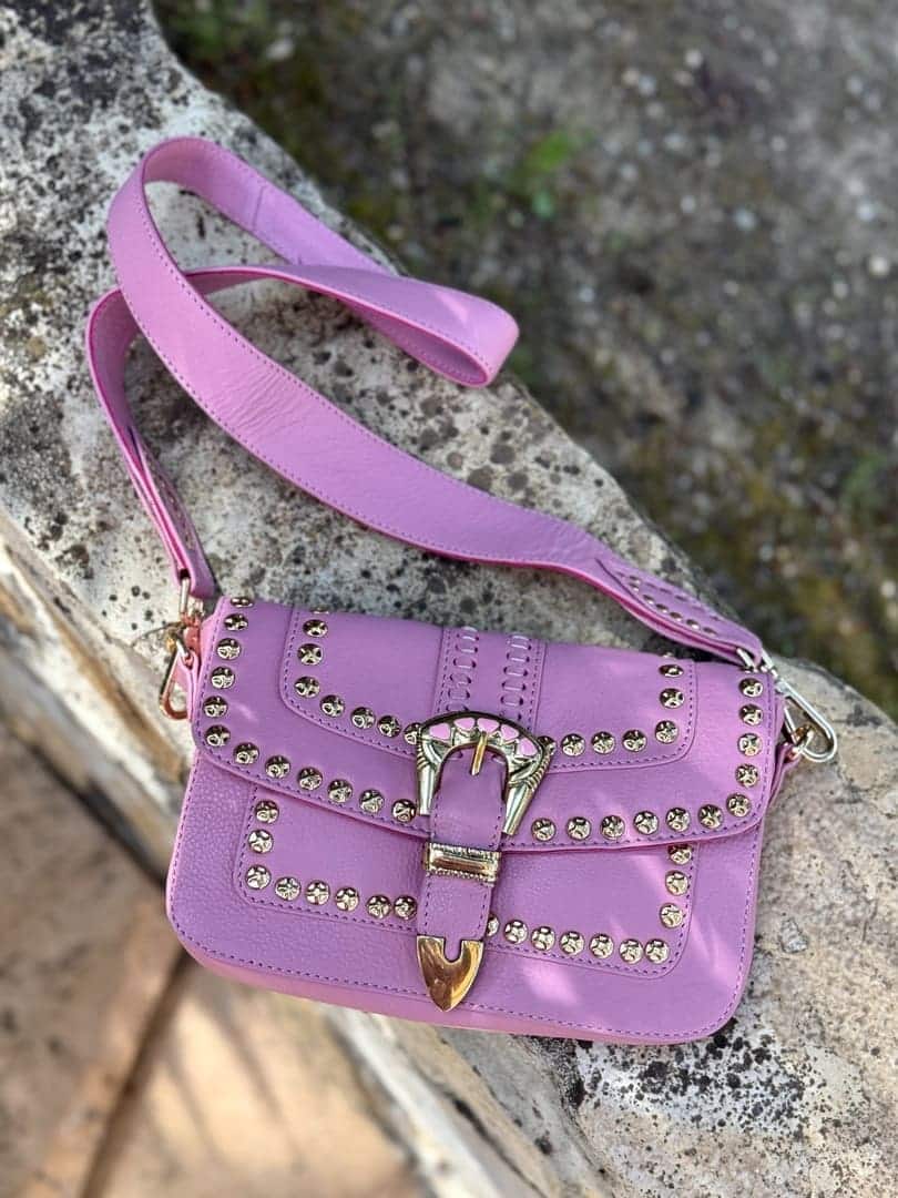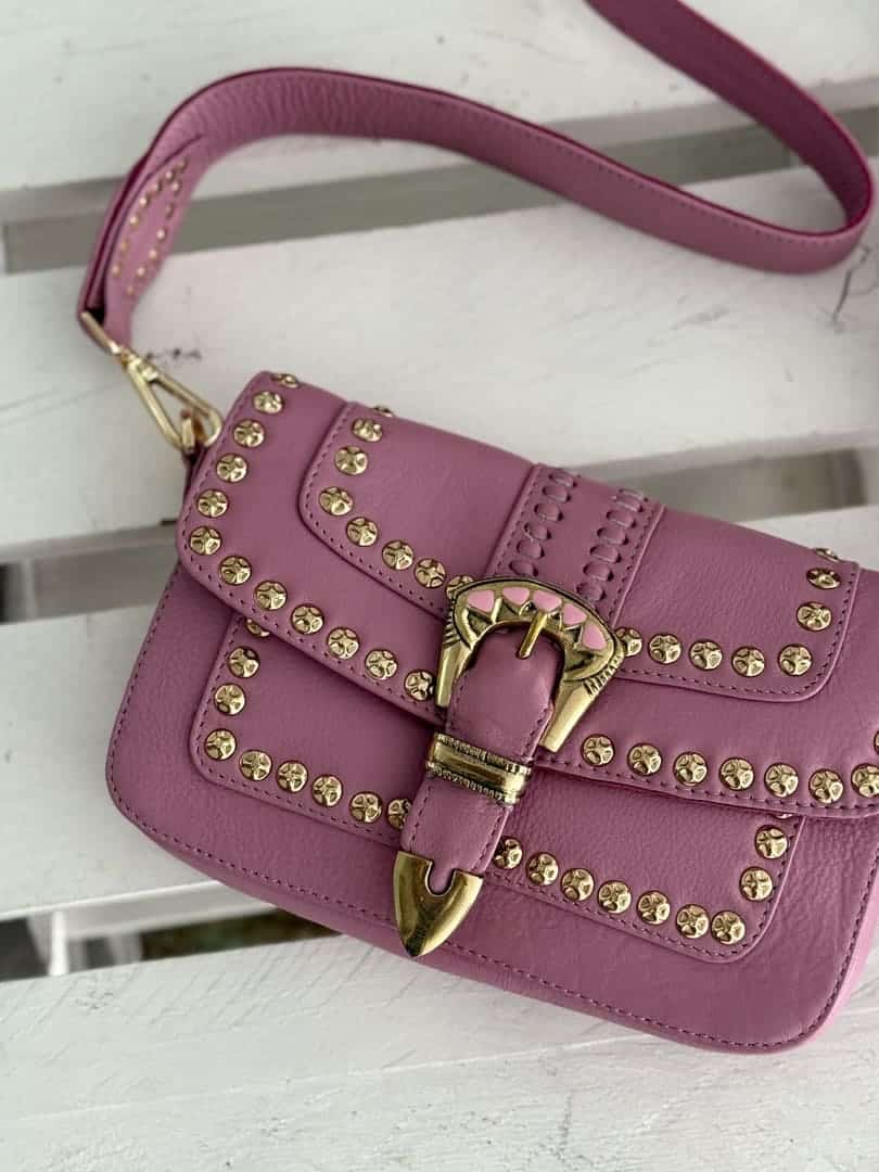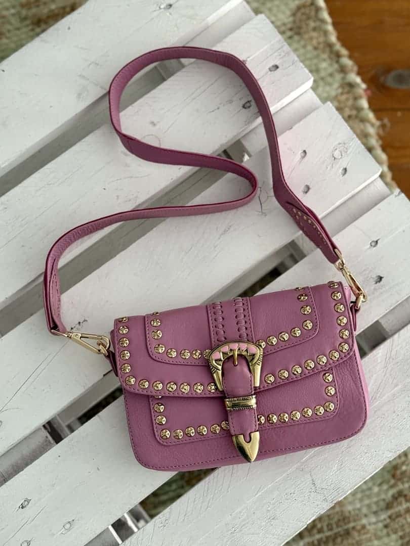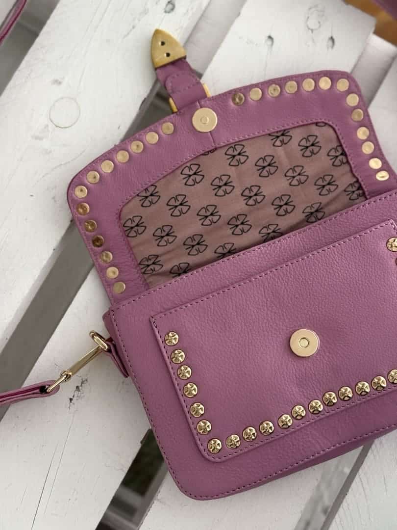 Sac Estella Pink Piti Cuiti en cuir nappa clouté couleur parme, forme rectangulaire à rabat aimanté avec boucle western, grande bandoulière en cuir amovible. Doublure coton et compartiments intérieurs.