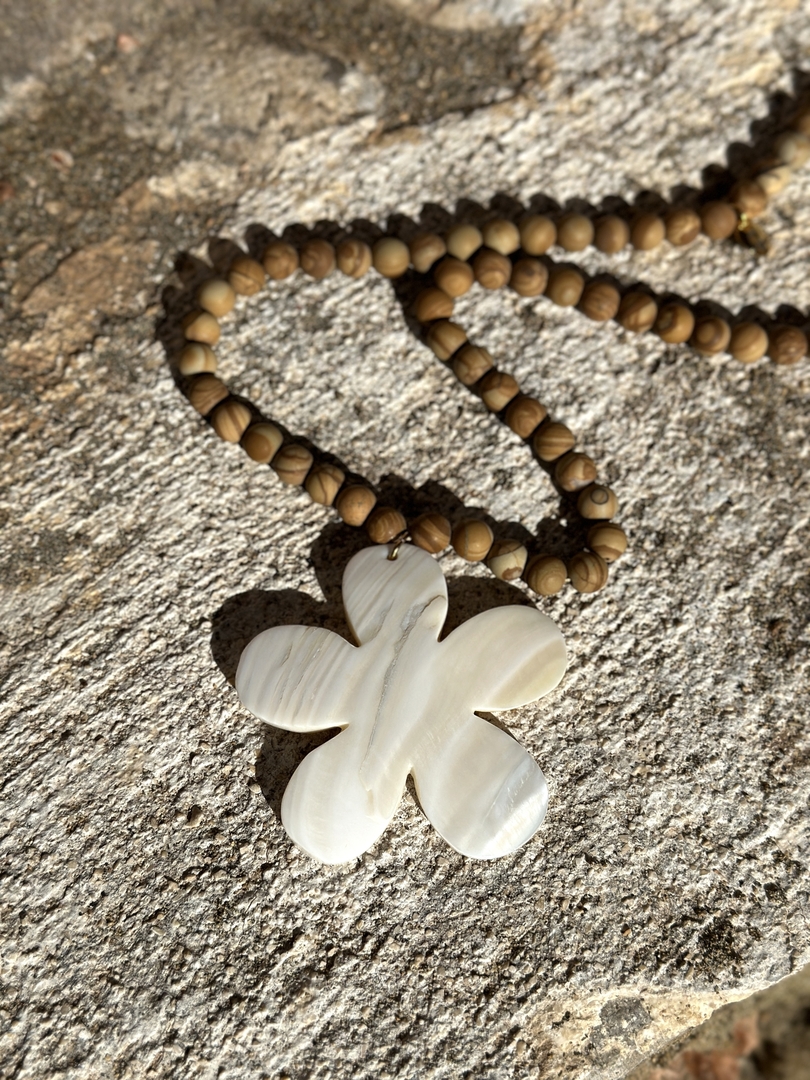 Sautoir Daisy Be Hippy composé d’une grande fleur en nacre sculptée à la main, montée sur un long collier de perles de jaspe bois.