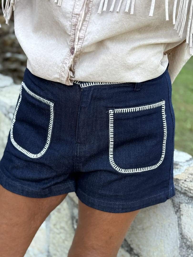 Short Minnesota en jeans bleu brut, taille haute à fermeture zip et poches plaquées, surpiqûres blanches.