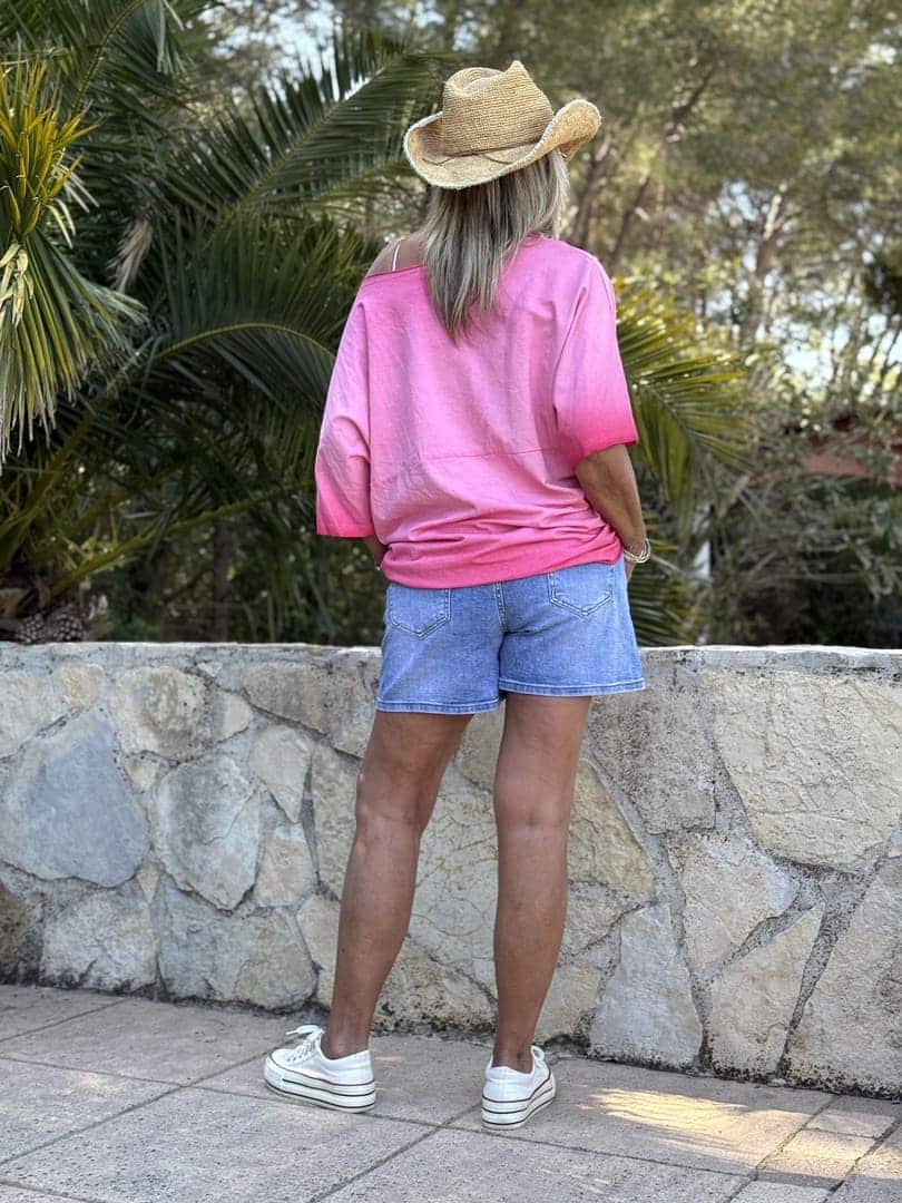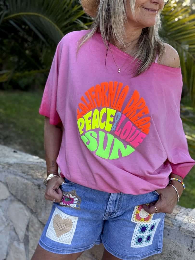 Sweat Peace Love Sun Kalifornia Dream en coton fin vintage délavé rose, coupe droite loose à encolure arrondie et manches courtes, impression colorée fluo sur l’avant.
