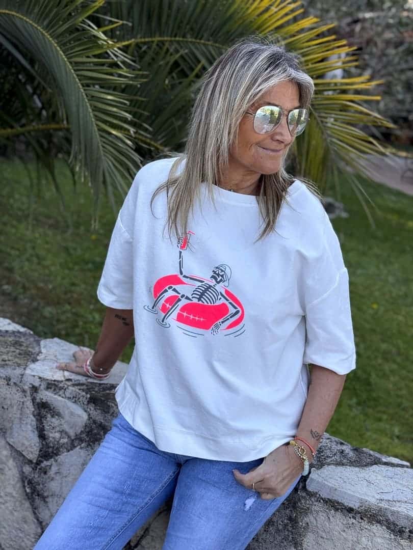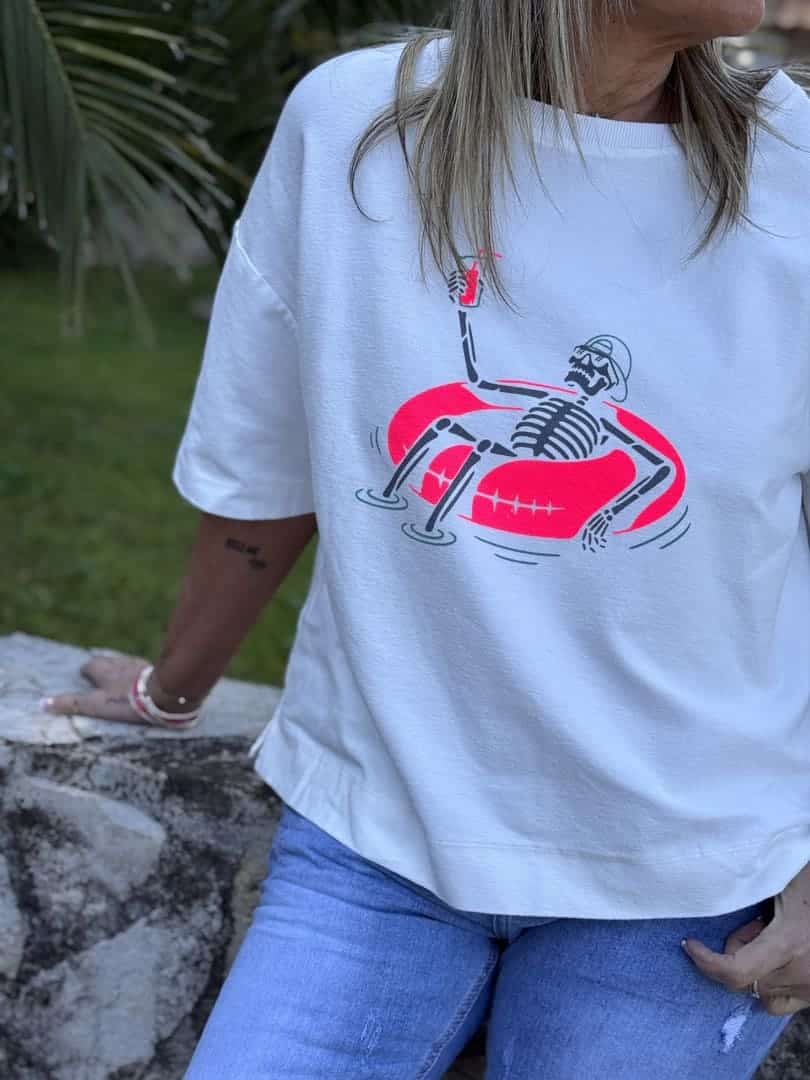 Sweat Skull Chillin Banditas from Marseille en coton blanc, coupe droite loose à manches courtes et encolure arrondie, finition côtelée. Motif squelette sur une bouée rose fluo imprimé sur l’avant.
