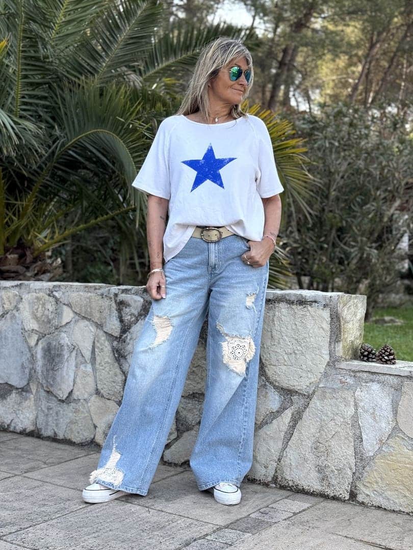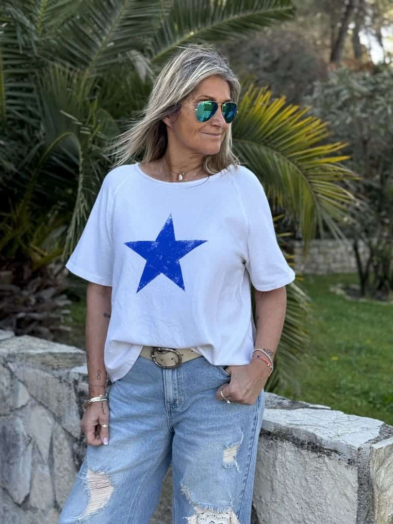 Sweat Smooth Star Banditas from Marseille en maille blanche, coupe droite loose à manches courtes et encolure arrondie, étoile bleu électrique imprimée sur l’avant.
