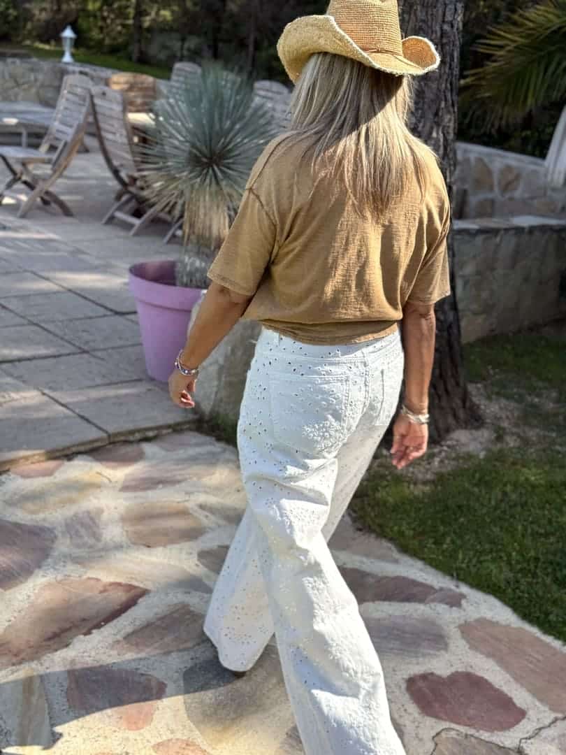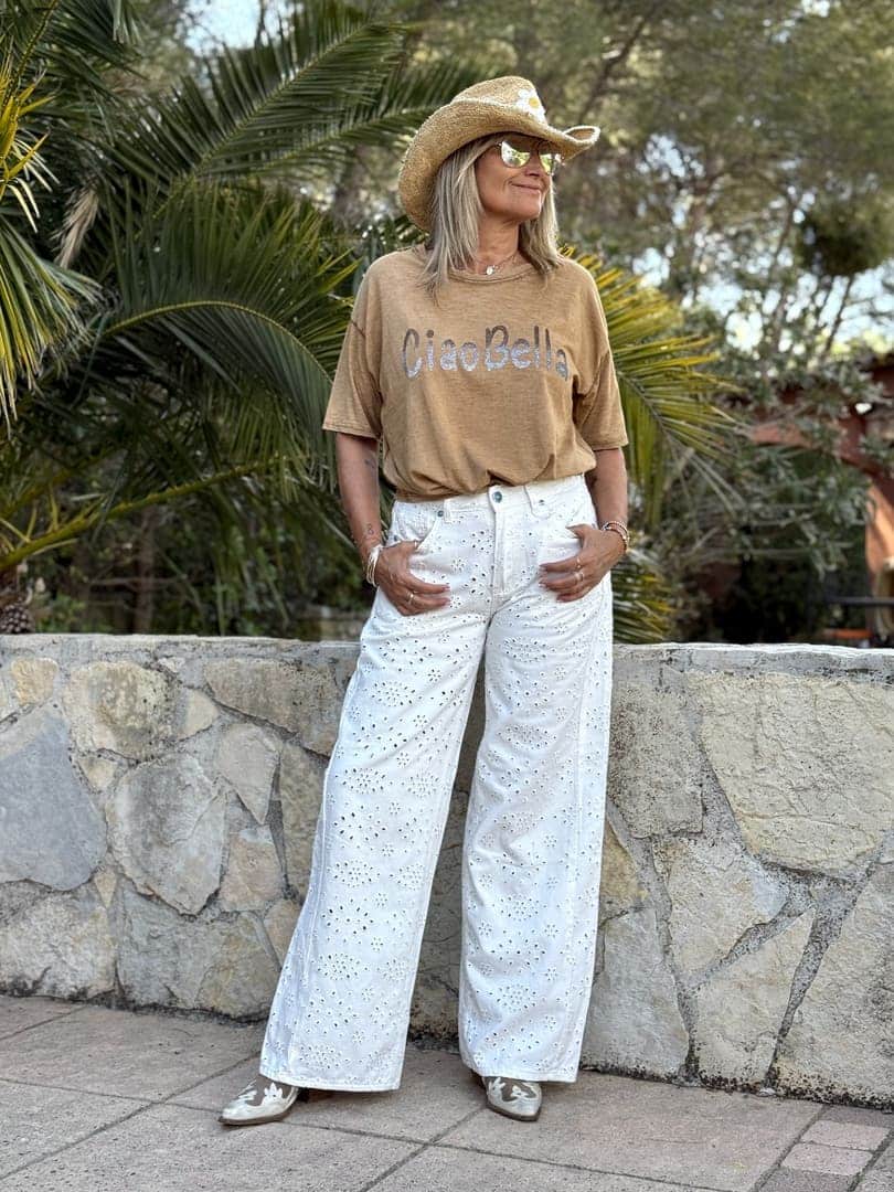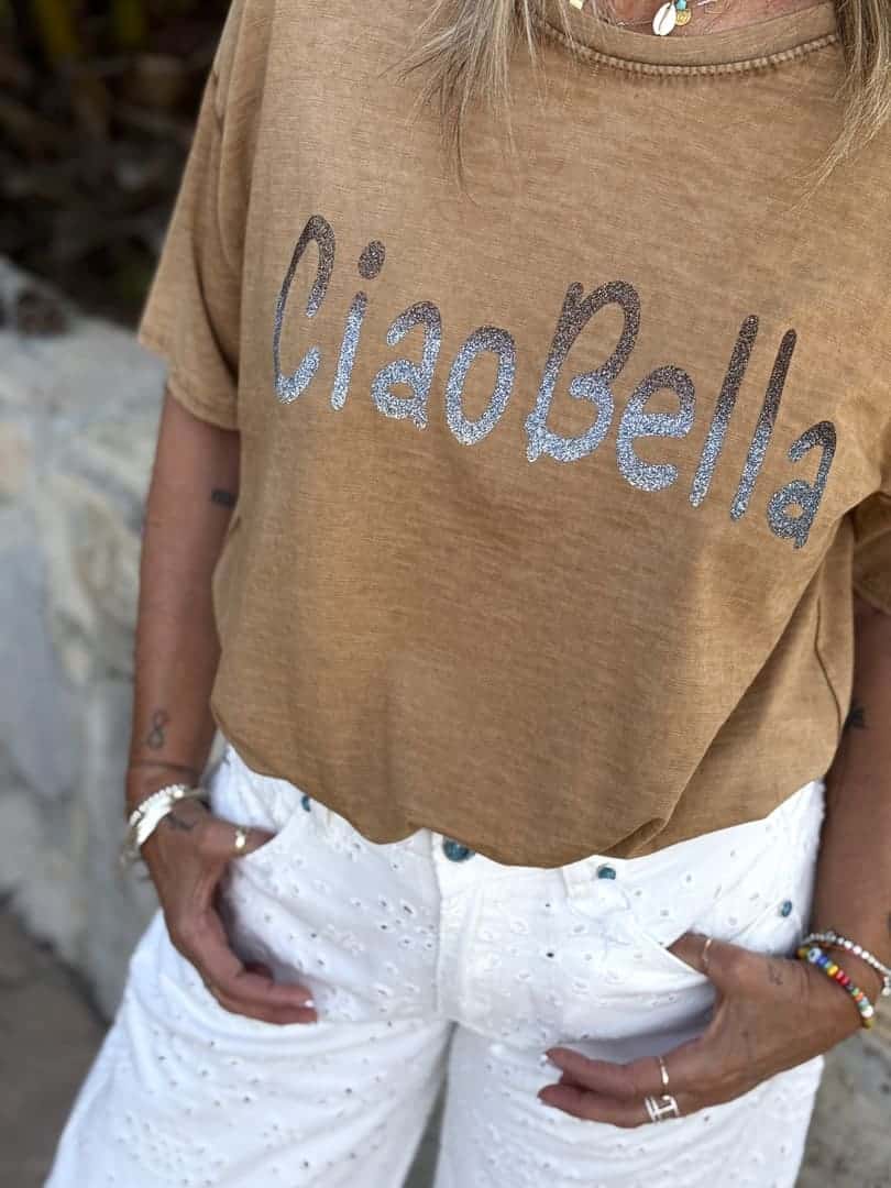 Tee shirt Ciao Bella Luxe en coton vintage délavé camel, coupe droite loose à manches courtes et décolleté arrondi, inscription paillettée sur l’avant.