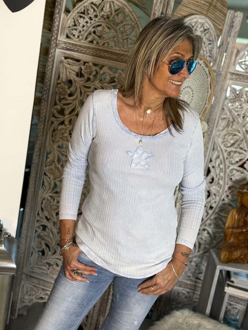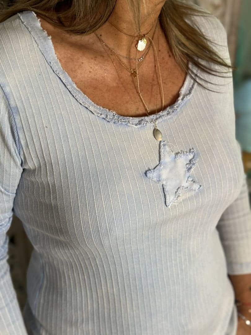Tee shirt Old Star en coton côtelé bleu ciel, coupe ajustée à manches longues et encolure arrondie finition effilochée, petite étoile cousue sur l’avant.