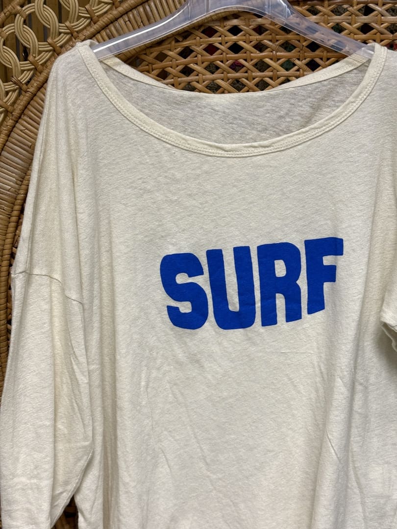 Tee shirt Surf Banditas from Marseille en coton et lin écru, coupe droite loose à manches longus et grande encolure arrondie, impression « Surf » bleu électrique sur l’avant.