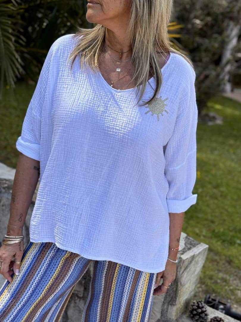 Tunique Sunrise to Sunset en coton gaufré blanc, coupe droite loose à manches trois quarts et décolleté V, print glitter doré dans le dos et sur la poitrine.